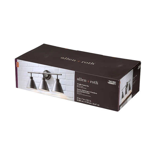 Model Description :22-in W 3-Light Raw Iron Finish with Raw Iron Metal Shade Vanity Light