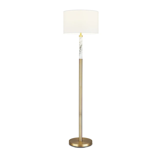 Add lighting to your living space with this Project Source floor lamp. Measuring 62 inches in height, it features an antique brass finish with a white linen shade and has an upper faux marble pole that gives it a unique look. This lamp will be a great addition to transitional decors. It requires one 150 W type A 3-way bulb or LED equivalent (not included).