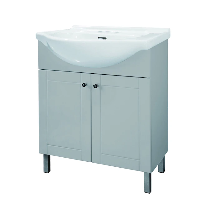 This elevated vanity with sink is ideal to fit in small to medium-sized bathrooms. Its Euro ceramic sink, grey cabinet and chromed legs will add a modern touch to your bathroom. It features two soft closing doors and chromed knobs. Preassembled, this vanity measures 30 in x 34 in x 19 in.