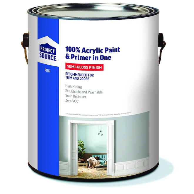 Project Source Plus Interior Acrylic 2-in-1 Paint/Primer – White – Semi-Gloss Finish – 3.78-L