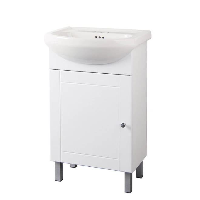 This elevated vanity and sink by Project Source with one door is perfect for small bathrooms or half-baths. Its modern style Euro ceramic sink will brighten your bathroom. It features a soft closing door and a chromed knob. Preassembled, this vanity measures 20 in x 34 in x 15 in.